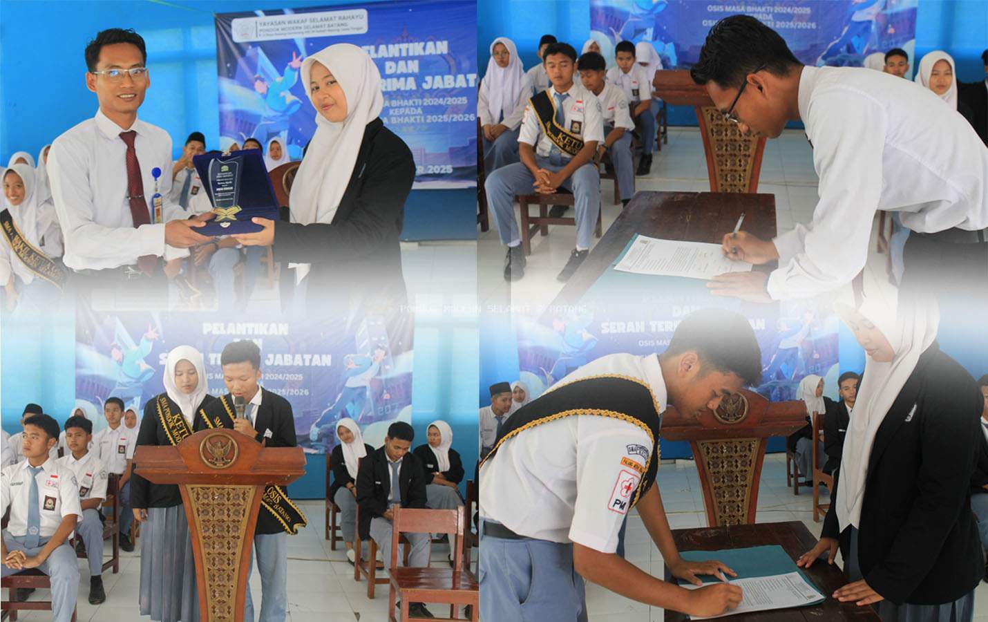 Acara dimulai dengan upacara pembukaan dan menyanyikan lagu Indonesia Raya dan Mars Pondok, dilanjutkan dengan pembacaan Surat Keputusan Kepala Sekolah tentang pengangkatan Pengurus OSIS periode 2025/2026. Pengurus baru kemudian maju untuk pembacaan ikrar dan pengucapan janji kepengurusan OSIS. Kepala SMA Pondok Modern Selamat 2 Batang, Pak Muhamad Asror, S.Pd., Gr menyampaikan dalam sambutannya bahwa OSIS adalah ujung tombak kegiatan kesiswaan dan wadah pembinaan karakter. Beliau menegaskan pentingnya peserta didik untuk menjadi generasi yang beriman, bertaqwa, memiliki kecakapan hidup, menjunjung budaya luhur, sekaligus peduli lingkungan. Beliau menambahkan bahwa OSIS harus menjadi role model dalam mewujudkan lingkungan sekolah yang disiplin, kreatif, dan berdaya saing global.