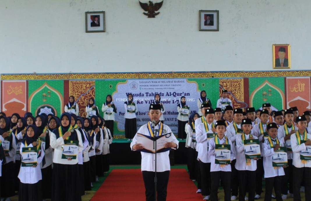 Pondok Modern Selamat Batang menggelar acara wisuda tahfidz pada tanggal 16 Februari 2024 yang berlangsung meriah dan penuh khidmat bertempat di Gedung Auditorium Pondok Modern Selamat Batang. Acara ini merupakan puncak dari program tahfidz yang telah berjalan di pondok, di mana para siswa dididik dan dibimbing untuk menghafal Al-Qur'an. Wisuda tahfidz ini diikuti oleh 209 peserta yang telah menyelesaikan hafalan Al-Qur'an dengan jumlah juz yang bervariasi, diantaranya :